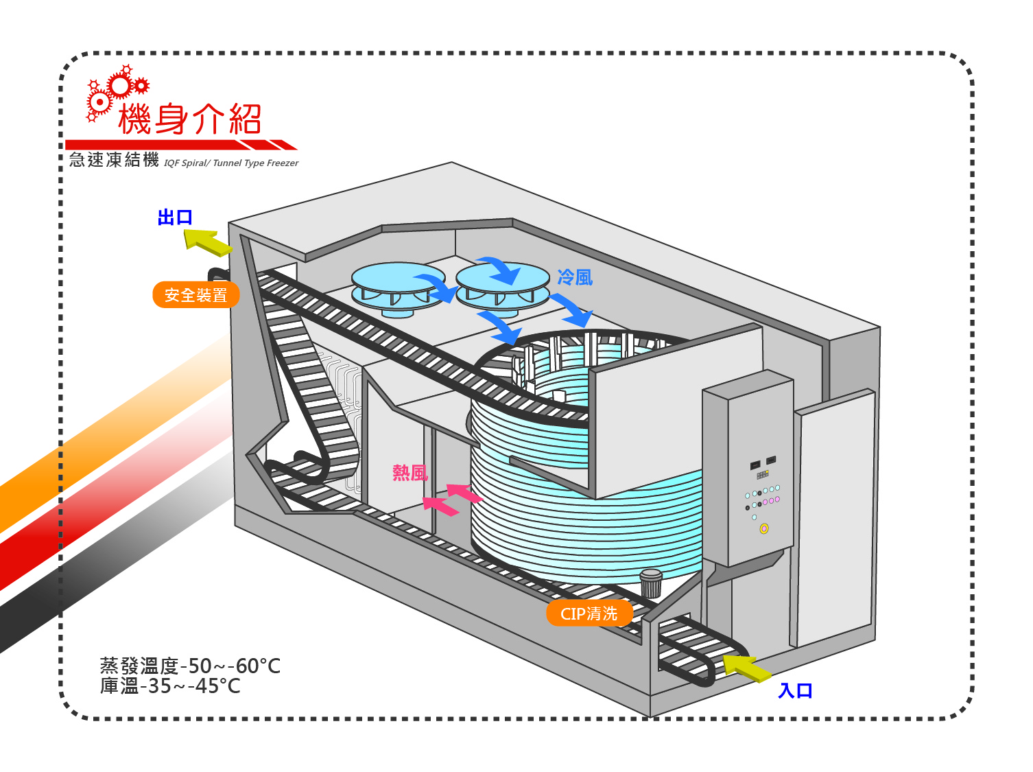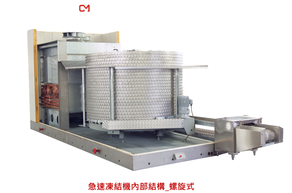 急速凍結機是一種連續式的凍結設備,分為隧道式和螺旋式,在生產線自動化安排極為容易,可大幅減少使用人力、提高生產率,且改良後的設備不僅體積大幅縮小,還達到長時間運轉免除霜,更可在工廠組裝即可;操作面板簡單,採用電子晶片積板控制迴路,可顯示運轉情形(庫內溫度、製成時間、異常顯示),讓操作人員充份了解運轉情形;減少傳統軌道,能大幅減少輸送帶間距,集中冷卻效果,以達到理想段積。